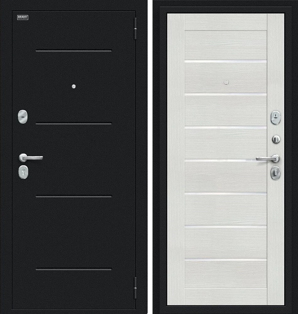 Надежная входная Дверь Браво Техно Букле черное/Bianco Veralinga премиум класса по цене 32 177 руб. Большая толщина стали защитит от проникновения в ваш дом, квартиру или коттедж. Используется очень качественная фурнитура: замки, цилиндры, ручки, защелки. Покрытие и отделка двери изготовлено под внимательным контролем производителя. Дверь имеет долгий срок службы и гарантию.