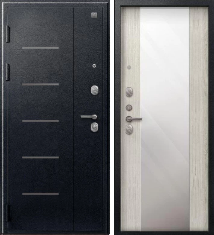 Надежная входная Дверь V-04 Черный муар - Полярный дуб Зеркало премиум класса по цене 43 427 руб. Большая толщина стали защитит от проникновения в ваш дом, квартиру или коттедж. Используется очень качественная фурнитура: замки, цилиндры, ручки, защелки. Покрытие и отделка двери изготовлено под внимательным контролем производителя. Дверь имеет долгий срок службы и гарантию.
